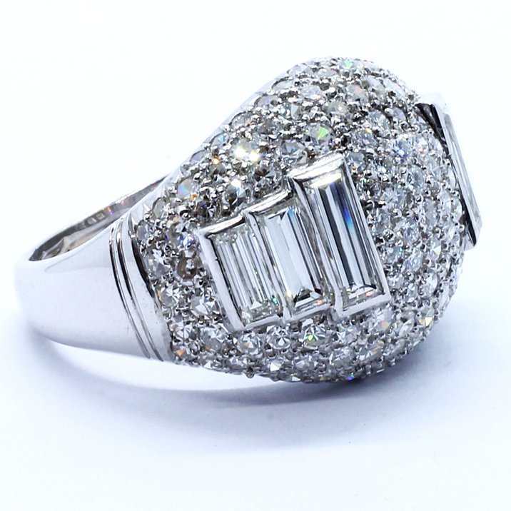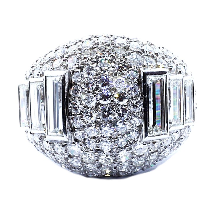 Anello in oro bianco 18kt e diamanti di altissima qualità taglio "round," "baguette" e "single cut" per un totale complessivo di 7 carati circa. E' proprio la diversità dei tagli su pietre di impeccabile brillantezza a creare particolarissimi ed unici effetti di luce. Pesa gr.13,48 e 18 è la misura al dito. Corredato di Certificato Gemmologico.