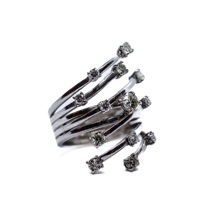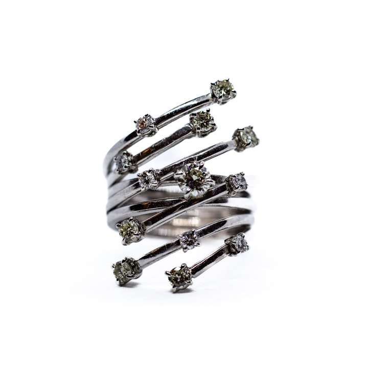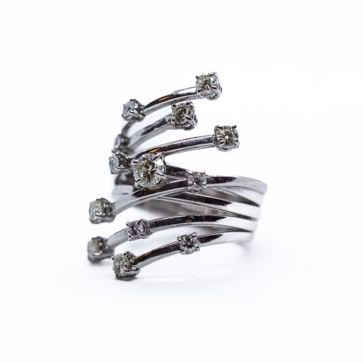 Particolarissimo anello in oro bianco 18kt e tredici diamanti taglio brillante di ottima qualità che vanno da un minimo di 0.05 carati ca. ad un massimo del centrale di 0.35 carati ca. per un totale complessivo stimato di 1.35 carati. Mis.17/57. Peso gr. 13.31. Certificato Gemmologico.