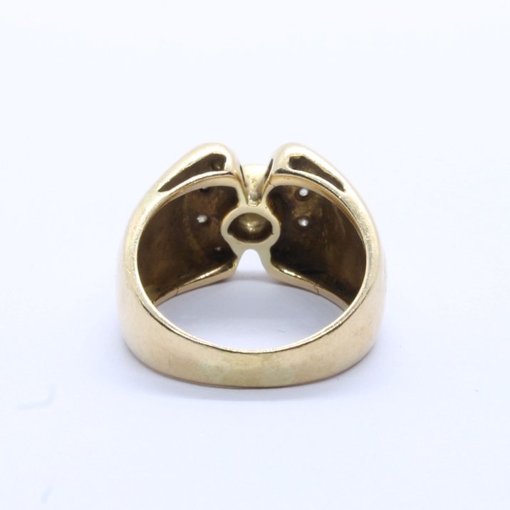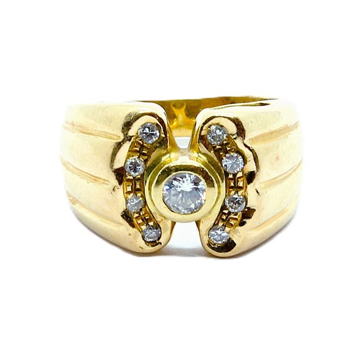 Anello in oro giallo 18kt e diamanti taglio brillante, 0,20 carati il centrale. Peso gr. 8,25.
