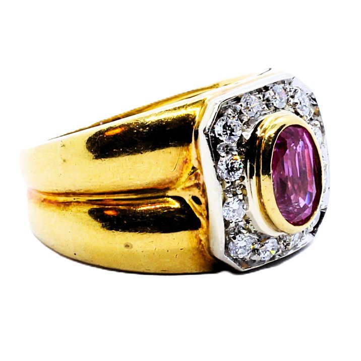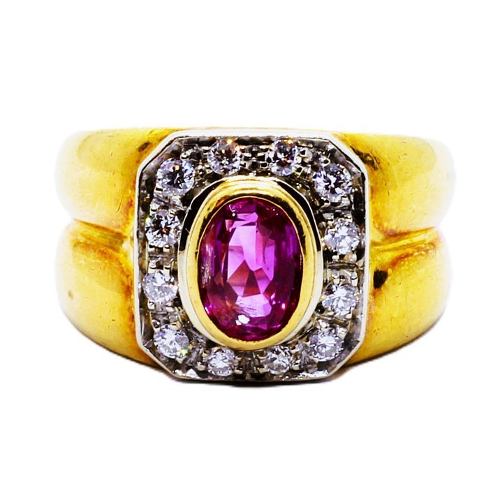 Anello anni 50 in oro giallo 18kt, splendido rubino da 1,0 ct. e 12 diamanti taglio brillante a contorno per 0,40 ct. Peso gr. 8,99.