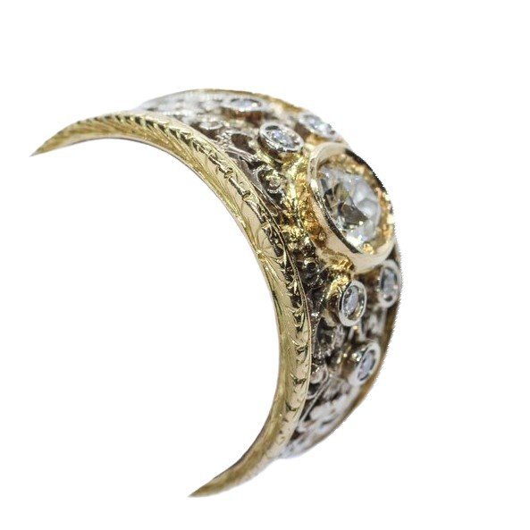 Nella prima metà del secolo scorso agli artigiani che lavoravano per Buccellati talvolta accadeva di farlo anche per conto proprio. E' il caso di questo bellissimo anello in oro giallo e bianco 18kt realizzato a traforo, bulino e cesello nel classico stile che rendeva la lavorazione simile ad una trina, al ricamo d'un merletto. Vi sono incastonati un diamante "old mine cut" da un carato circa e sei diamanti taglio "round brilliant" come pietre di contorno. E' fornito di Certificato Gemmologico.