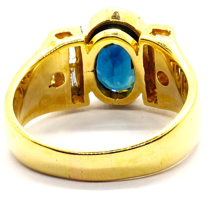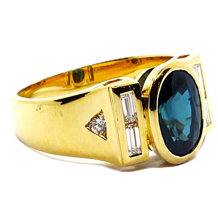 Anello in oro giallo 18kt con zaffiro centrale di 5,00 carati ca. con ai lati diamanti taglio baguette e round brilliant cut di altissima qualità per 1 carato ca. La misura al dito (sempre modificabile) è 18/58; il peso è 9,40 grammi.