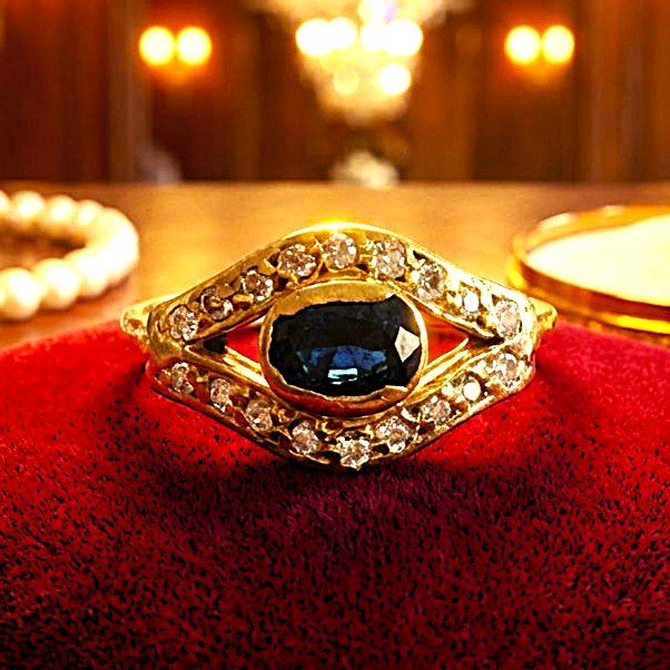 Anello in oro giallo 18kt, zaffiro e diamanti taglio brillante. La misura (sempre modificabile) è 16/56, il peso 3,07 grammi.