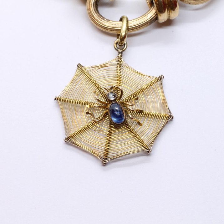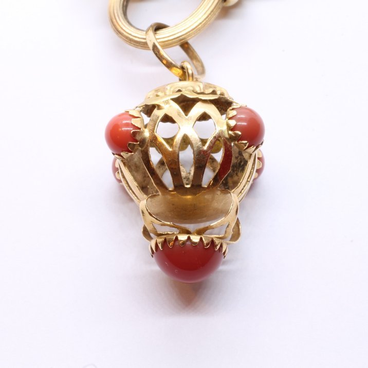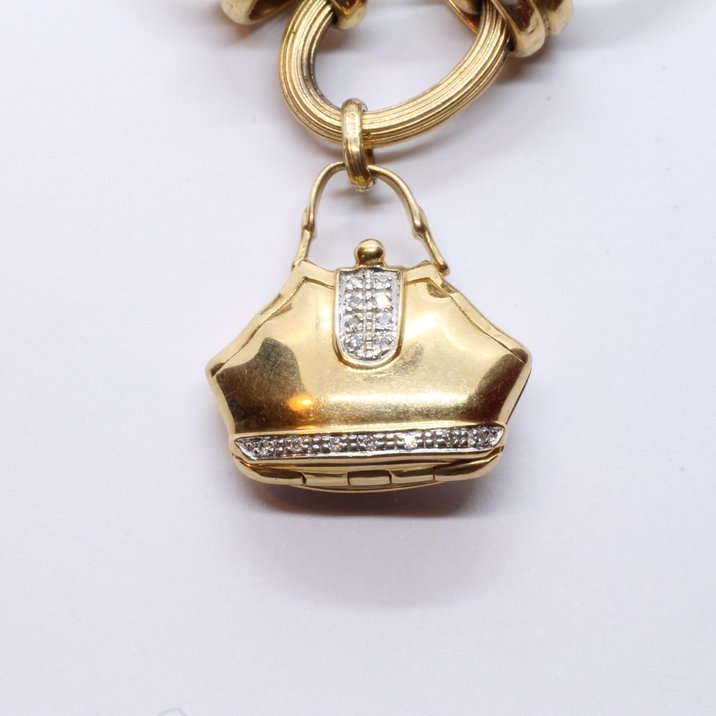 Bracciale "charms" anni 50 in oro giallo 18kt, diamanti taglio brillante, corallo, avorio, turchese, diamante taglio rosetta e zaffiro cabochon. Peso gr. 36,73.