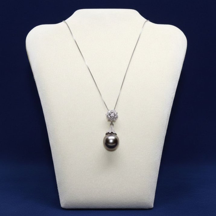 Collana oro bianco 18 kt, diamante taglio brillante da 0.05 ct. ca. e perla grigia Tahiti 11,96 mm. La perla è di altissima qualità per lustro, superfice pressochè perfetta e "oriente", lucentezza irridescente con bagliori rosati.