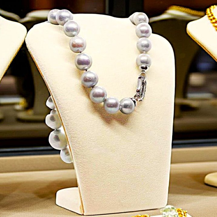 Sono trentuno bellissime perle "south sea" grigio chiare e chiusura in oro bianco 18kt su cui sono incastonati ventotto diamanti tg. brillante. Il diametro delle perle, leggermente degradè, va da un minimo di 12,30 mm. ad un massimo di 16,70 mm. Peso totale 105,78 grammi.