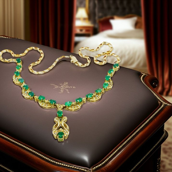Collana in oro giallo 18kt, diamanti taglio brillante e 18 smeraldi per una caratura complessiva di 20 carati circa. Peso gr. 27,27.