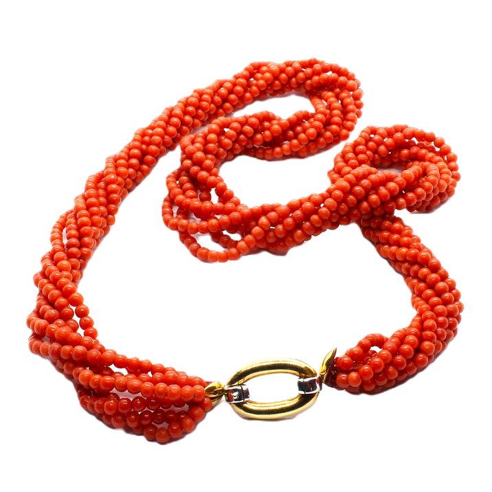 Collana "torchon" in corallo rosso con fermezza in oro bianco e giallo 18kt. Lunghezza cm. 50,5. Peso gr. 58,78.