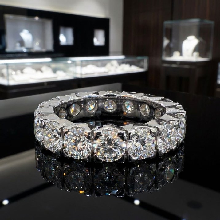 Riviera "eternity" in oro bianco 18kt con 16 diamanti taglio brillante dall'eccezionale qualità di carati 0,33 circa cadauno per un totale quindi abbondantemente superiore ai 5 carati. Pesa 8,66 grammi ed è accompagnato da Certificato Gemmologico.