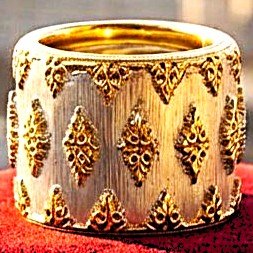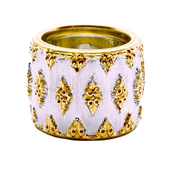 Anello Mario Buccellati in oro 18kt giallo e bianco nella classica lavorazione. Firmato sul bordo interno. Pesa gr. 16,70. 1950 ca.