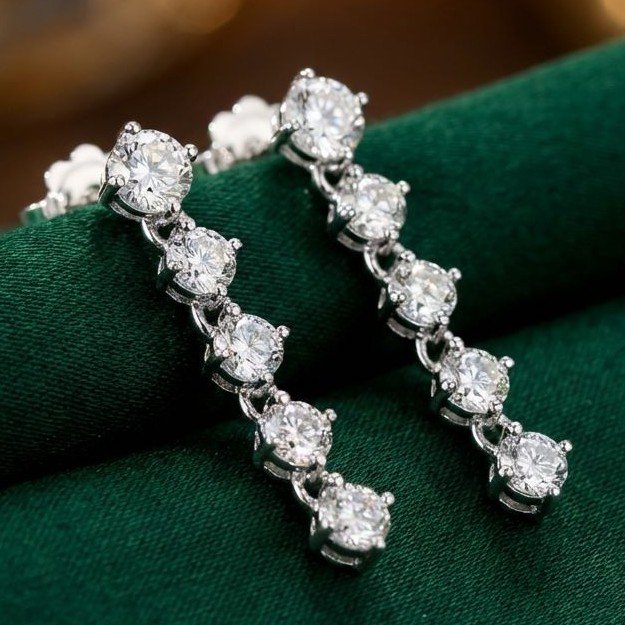 Altissima la qualità dei diamanti, per una caratura complessiva di 1,50 carati circa, in questi orecchini pendenti realizzati in oro bianco 18kt. Lunghezza max. mm. 24,0: Peso gr. 3,34.
