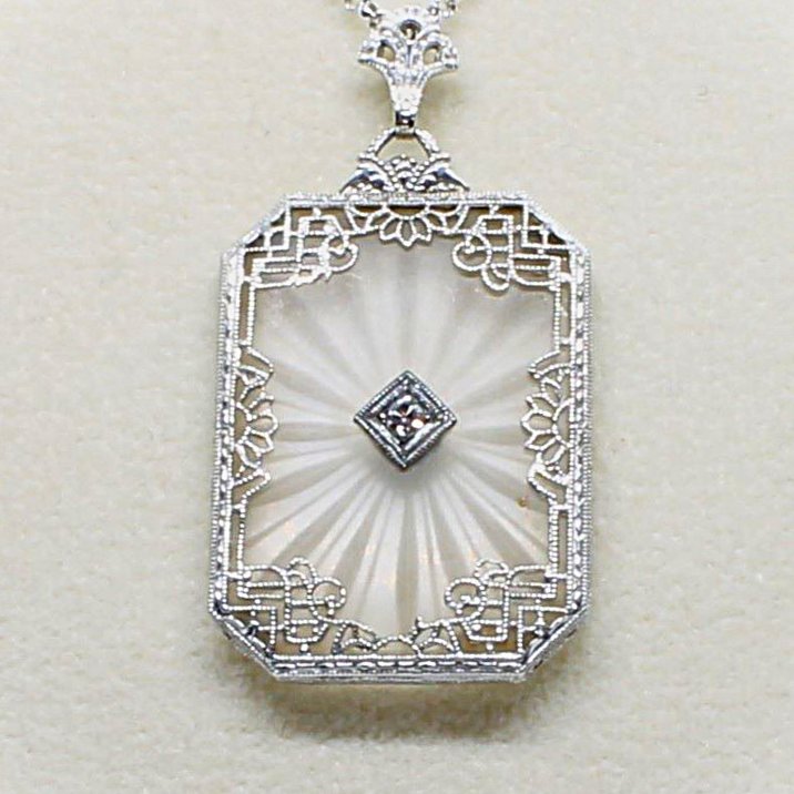Collino con pendente in oro bianco 18kt e cristallo di rocca sabbiato e inciso a raggiera con al centro un diamante "single cut". Periodo Liberty.