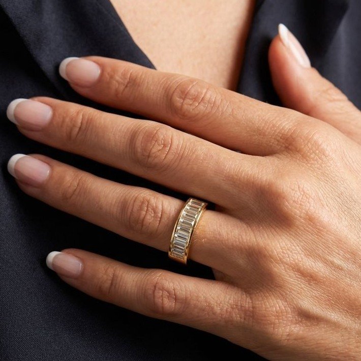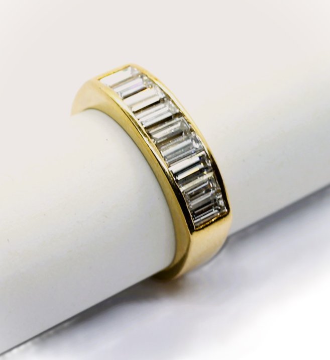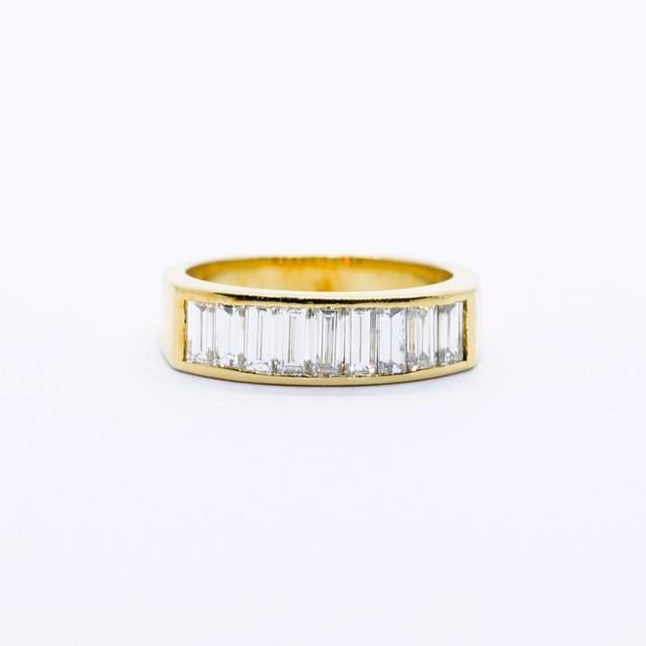 Anello "riviere" in oro giallo 18kt e diamanti tg. baguette per un carato ca. Diamanti impeccabili per pressochè totale assenza di inclusioni e alto grado di colore. La misura è 15/55 e pesa 6,30 grammi.