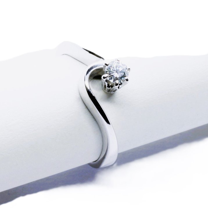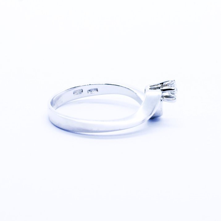 Diamante taglio brillante (0,20 carati ca.) di ottima qualità per colore, purezza e accuratezza del taglio montato su oro bianco 18kt. La misura (sempre modificabile) dell'anello è 15/55 e gr.3,44.