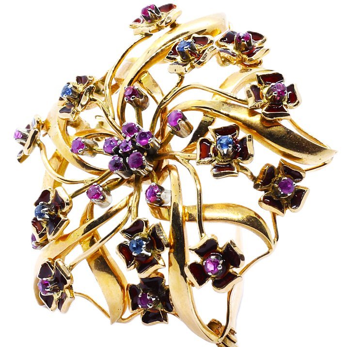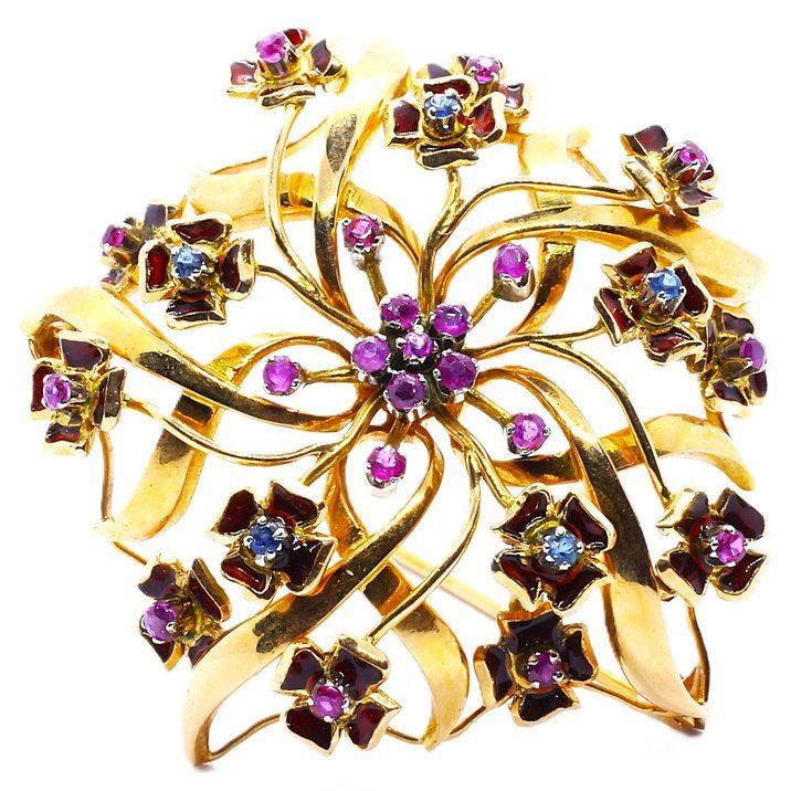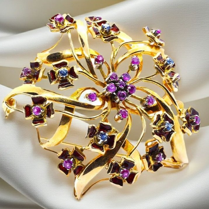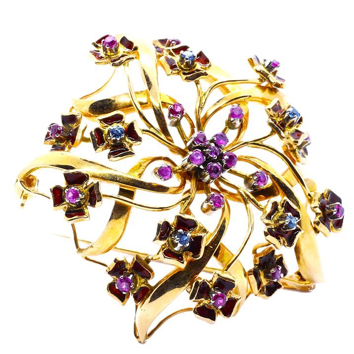 Spilla in oro giallo 18kt, rubini e zaffiri. Pesa 19,72 grammi.