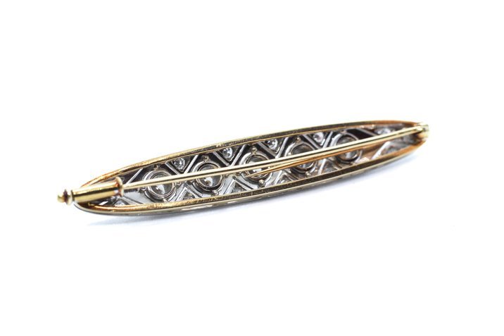 Spilla anni 40 in oro bianco e giallo ( entrambi 18kt) e diamanti. I diamanti più grandi, disposti in orizzontale, sono tagliati "round brilliant" mentre quelli di contorno "single cut". Il tutto per carati 1,45 ca. totale complessivo. Peso: gr. 9,85. Misura cm. 6,5 per lunghezza e cm. 1,0 per larghezza. Qualità eccezzionale per i diamanti sia per quanto concerne il taglio, la purezza (VVS/VS) e il colore (E/F). Corredata di Certificato Gemmologico.