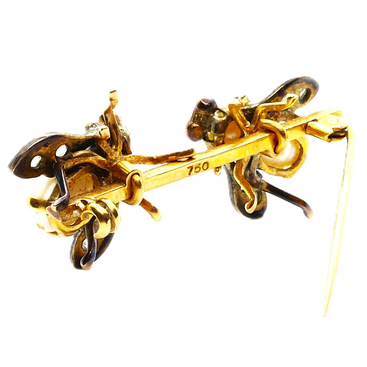 Spilla primi 900 in oro giallo 18kt, argento, perle e diamanti taglio rosetta. Peso gr.8,25.
