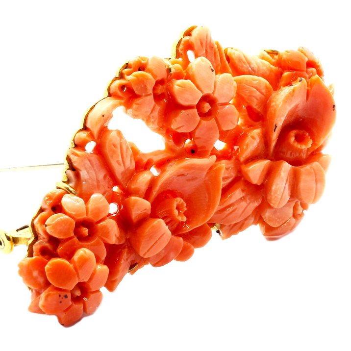 Scultura rappresentante gruppo di fiori in corallo rosa su cornice di oro giallo 18kt, il tutto a formare una spilla. Mm. 62x37. Pesa 23,57 grammi.