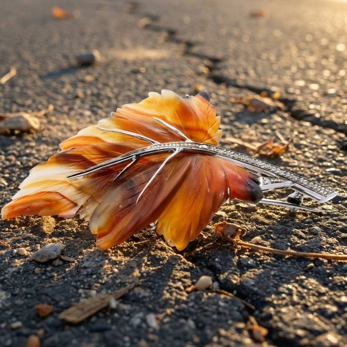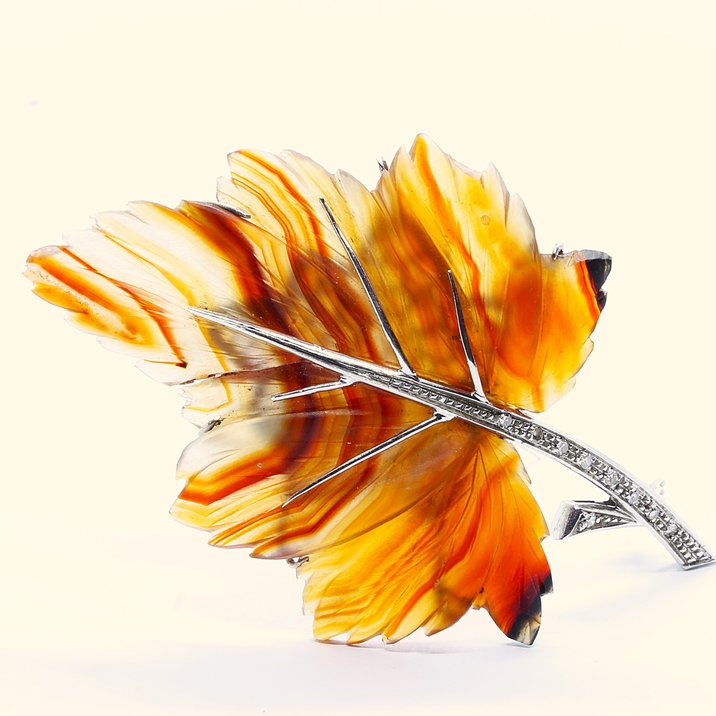 Agata scolpita a guisa di foglia retta da un "gambo" in oro bianco 18kt impreziosito da nove diamanti taglio "single cut". Lunghezza max. 65 mm. larghezza max. 45 mm. Peso gr. 13,00.