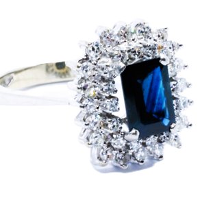 Anello in oro bianco, zaffiro e diamanti taglio brillante